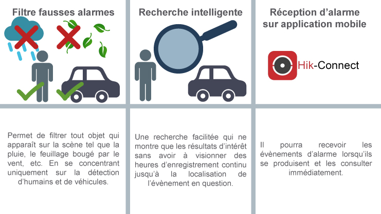 La tecnologie pour la détection de mouvement Motion detection 2.0 de Hikvision permet de trier les détections d’humains et de véhicules pour faciliter à l’utilisateur la recherche vidéo sur les enregistrements.
